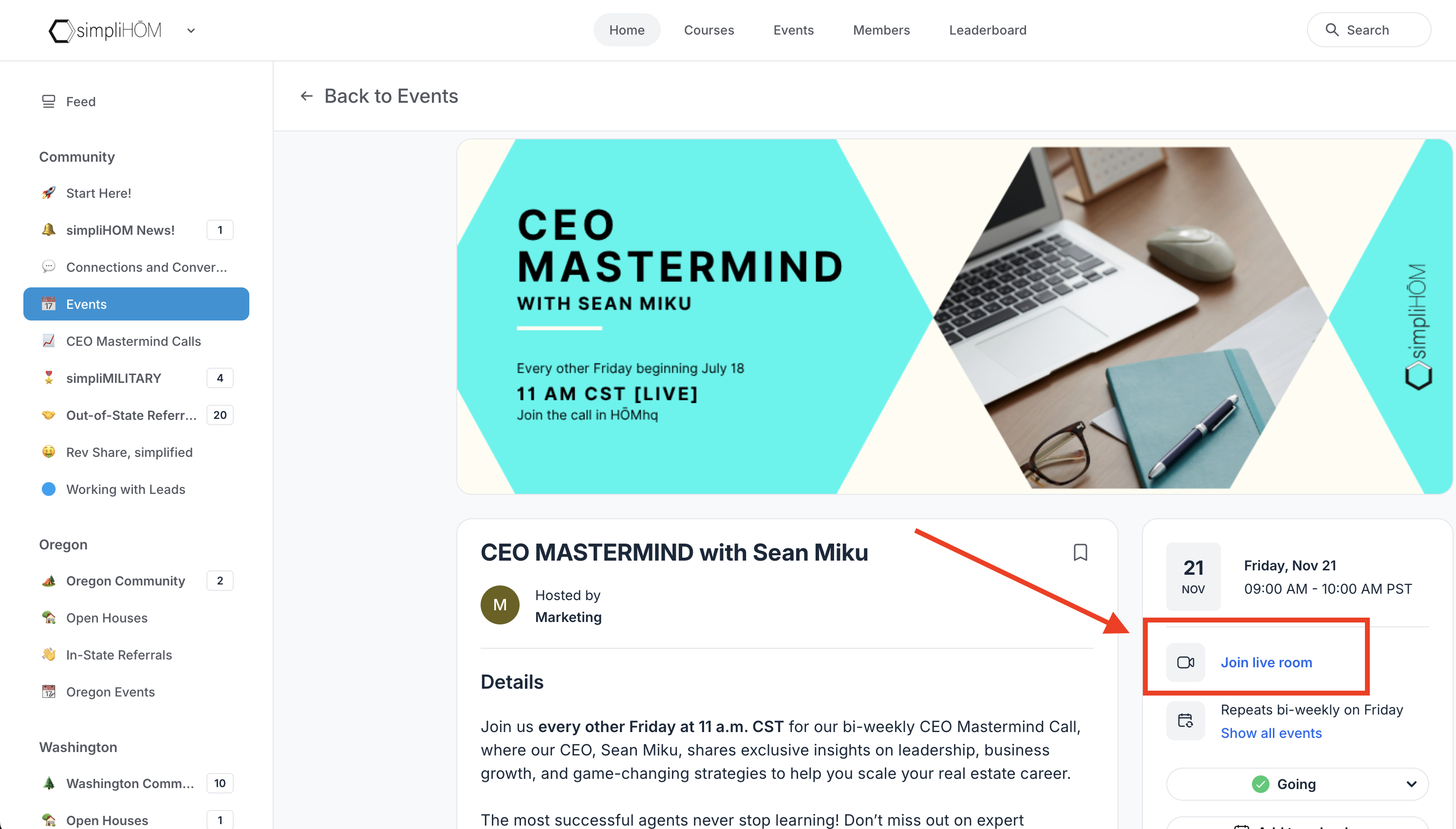 Inside simpliCOMMUNITY, navigate to Events (one of the 5 tabs near the top of the page), then scroll down until you find the next CEO Mastermind Event.